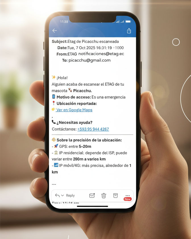 Cada vez que alguien lea el ETAG recibirás un correo de notificación inmediatamente. Si el dispositivo lo permite también recibirás la ubicación GPS del lugar de lectura.