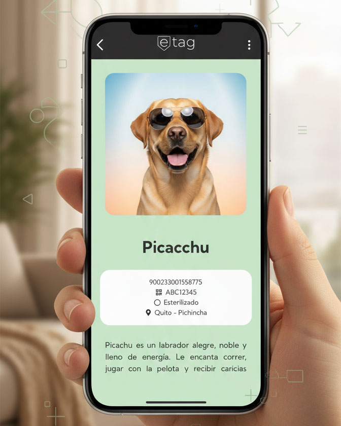 La placa ETAG está vinculada a un perfil digital de la mascota, accesible a través de un escaneo del código QR, permitiendo a los tutores y otras personas acceder a la información necesaria en caso de emergencia o extravío.